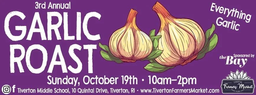 Tiverton Farmers Market Garlic Roast Sunday, October 19, 2025 10:00 AM 2:00 PM Tiverton Middle School (map) Google Calendar ICS